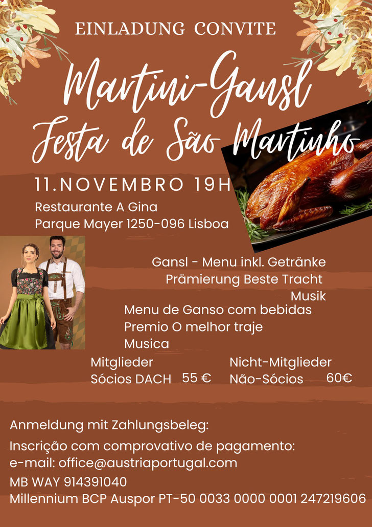 Anmeldungen bitte bis zum 21.Oktober an Martin Stadter: Per Email an martin.stadter@spacecreation.biz oder telefonisch an TM 917 871 571 mit Nachweis der Überweisung des entsprechenden Betrages auf das Konto des DVL, Clube Alemão, IBAN PT50 0033 0000 0000 0415 6266 5 oder per Bezahlung via MBWay.